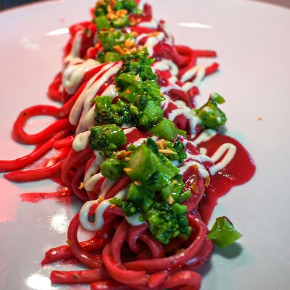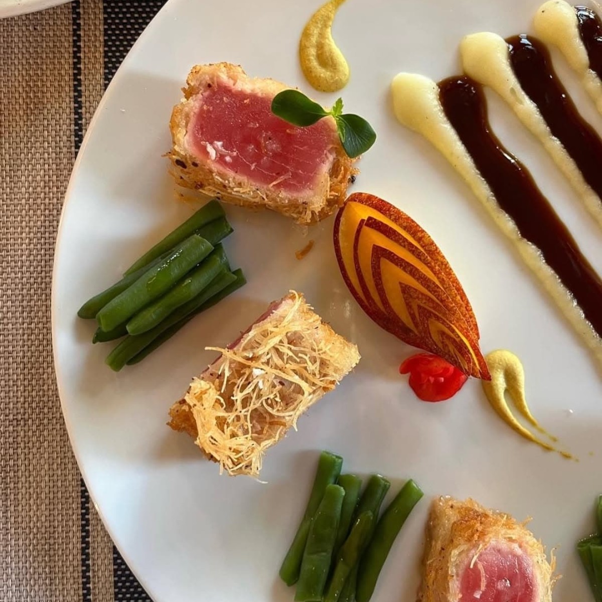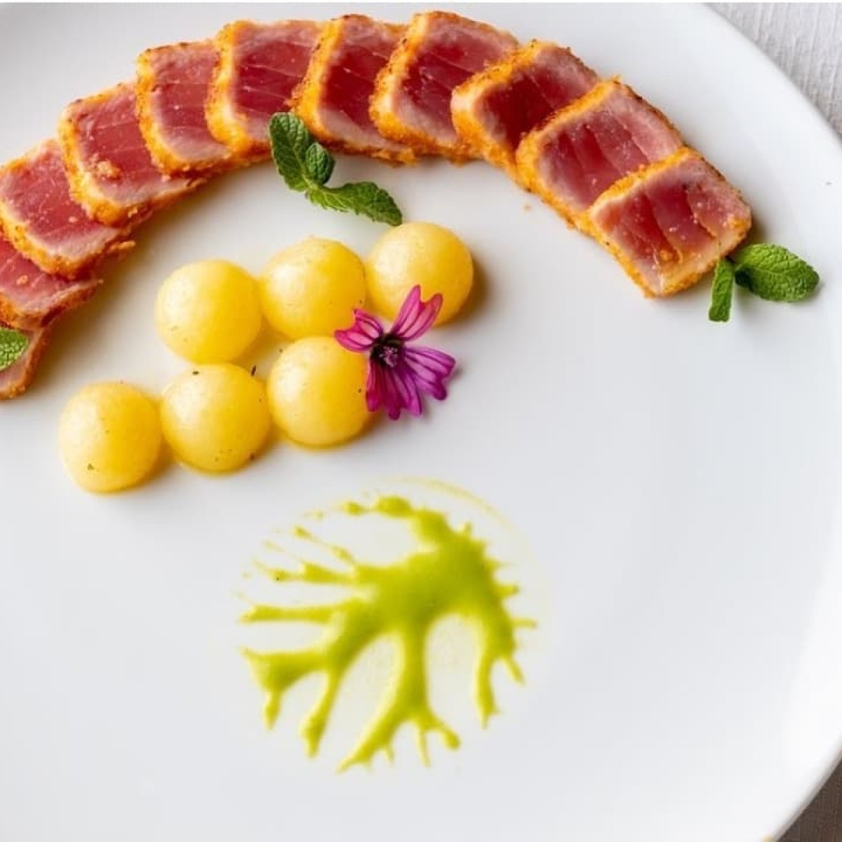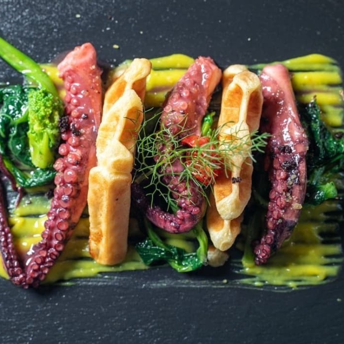La cucina a vista è il cuore pulsante di Yellow Scapece: qui lo chef Demis Pastore trasforma pesce freschissimo e ingredienti locali in piatti che sorprendono per estetica e sapore. Tra i protagonisti del menu spiccano il gambero viola di Gallipoli, i crudi di mare serviti come tavolozze di colori e sapori, e primi piatti di pasta fresca realizzata in casa. Ogni portata racconta il territorio, con accostamenti creativi e impiattamenti curati nei minimi dettagli.