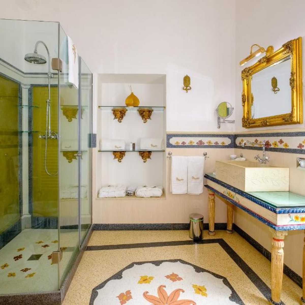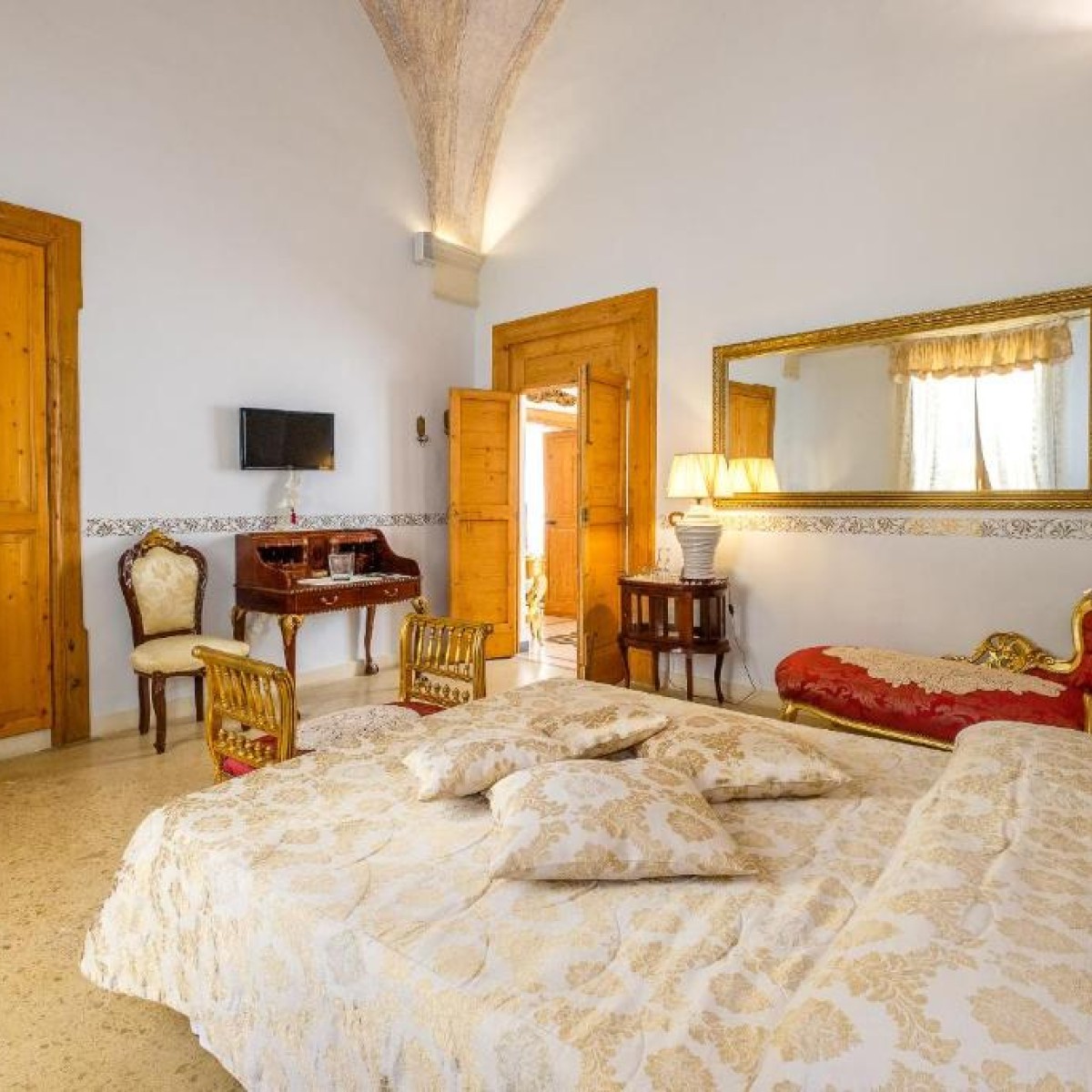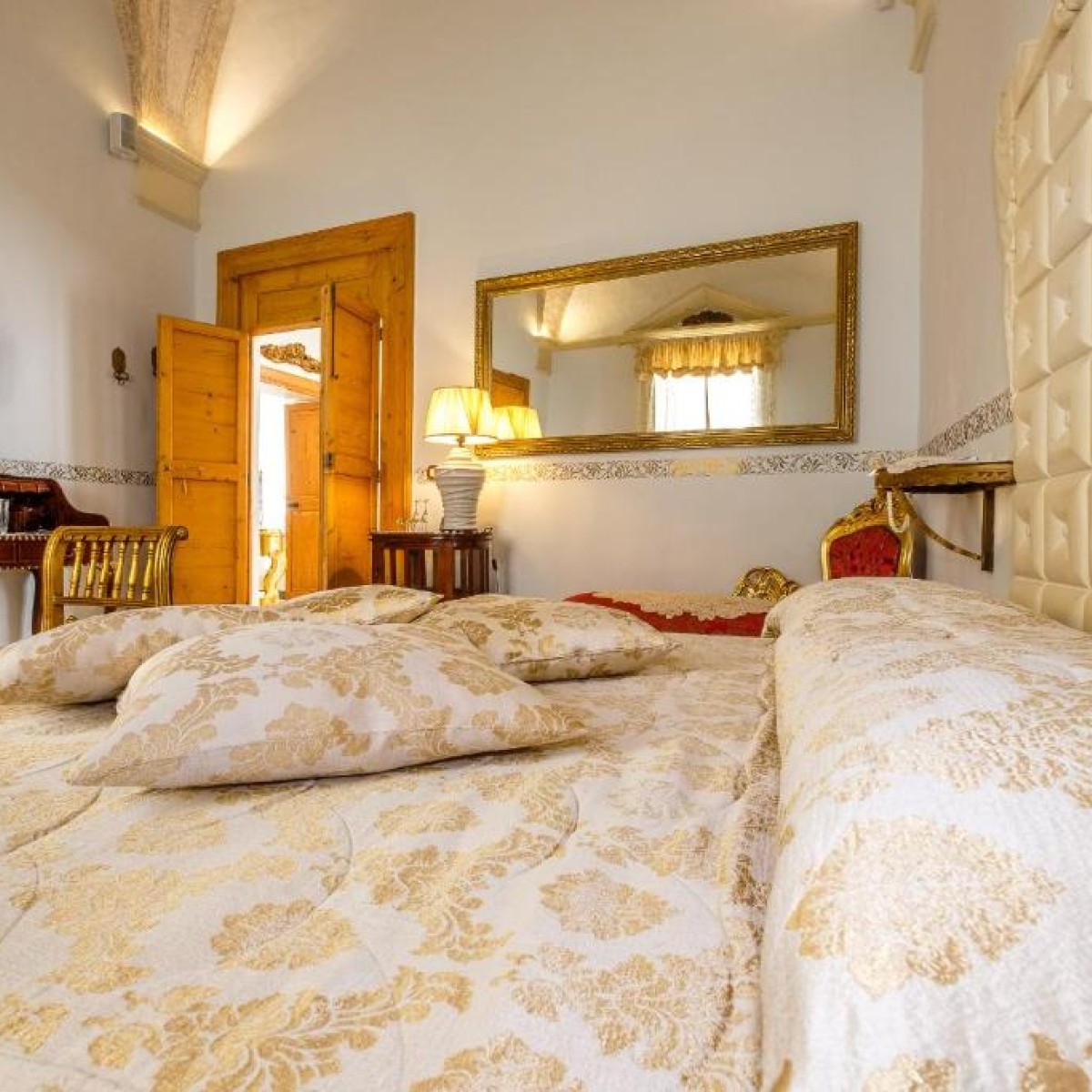 Suite Superior posta al piano primo di Palazzo Gallo Resort. Piena di affreschi, mosaici, coppia di lampadari di Murano abbinati e tanto altro da scoprire. Questa camera non smetterà mai di sorprenderti: dall'ingresso, al bagno, alla camera è un insieme armonioso di stili e riferimenti al classicismo Salentino.